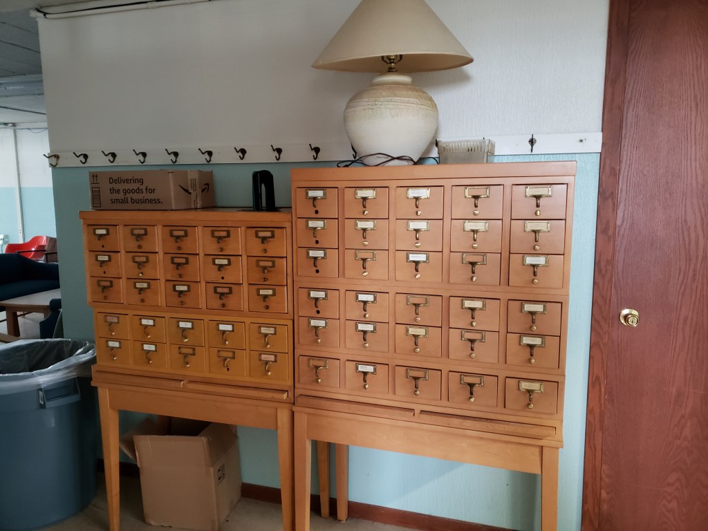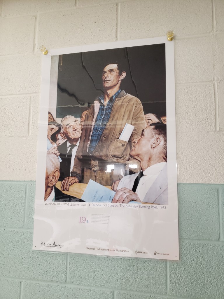 Tami Bartoli – the director – also took me down to show me the lower level, where they shelve the extra library books and DVDs as well as items they’re looking to discard. They keep them along the walls and in an extra room by the doors. It’s a roomy space, where they have meetings and storytimes at. In addition, it’s sparsely decorated with various paintings from the Picturing America series.