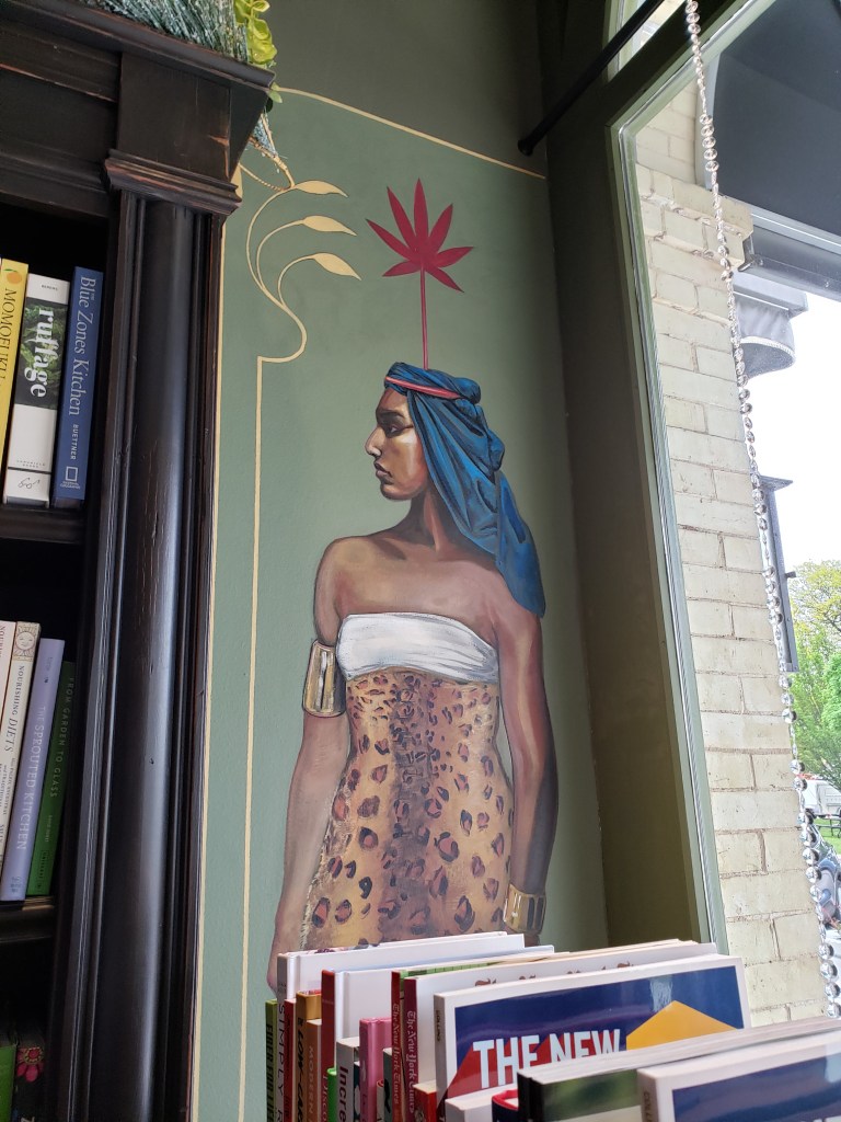 The aesthetics that stood out the most were the fireplace and the murals of four Goddesses of Wisdom from Greek, Norse, Egyptian, and Hindu mythology.