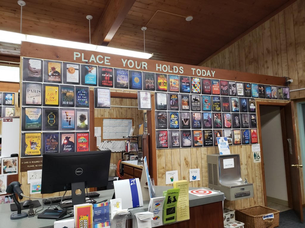 According to the staff, it’s not much of a browsing library since it’s a small building. This explains why there were only a few chairs that people can sit in. A lot of patrons like to primarily place holds and pick up them up. It has a neat system for doing that. The workers at the front desk place covers of new books on the back wall to show patrons what’s new every month.