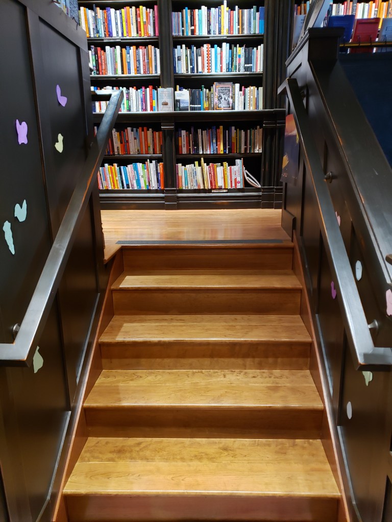 It consists of two levels. The lower one contains adult fiction, young adult novels, and juvenile titles. The upper one, which only takes a few steps to get to, primarily consists of adult nonfiction ones.