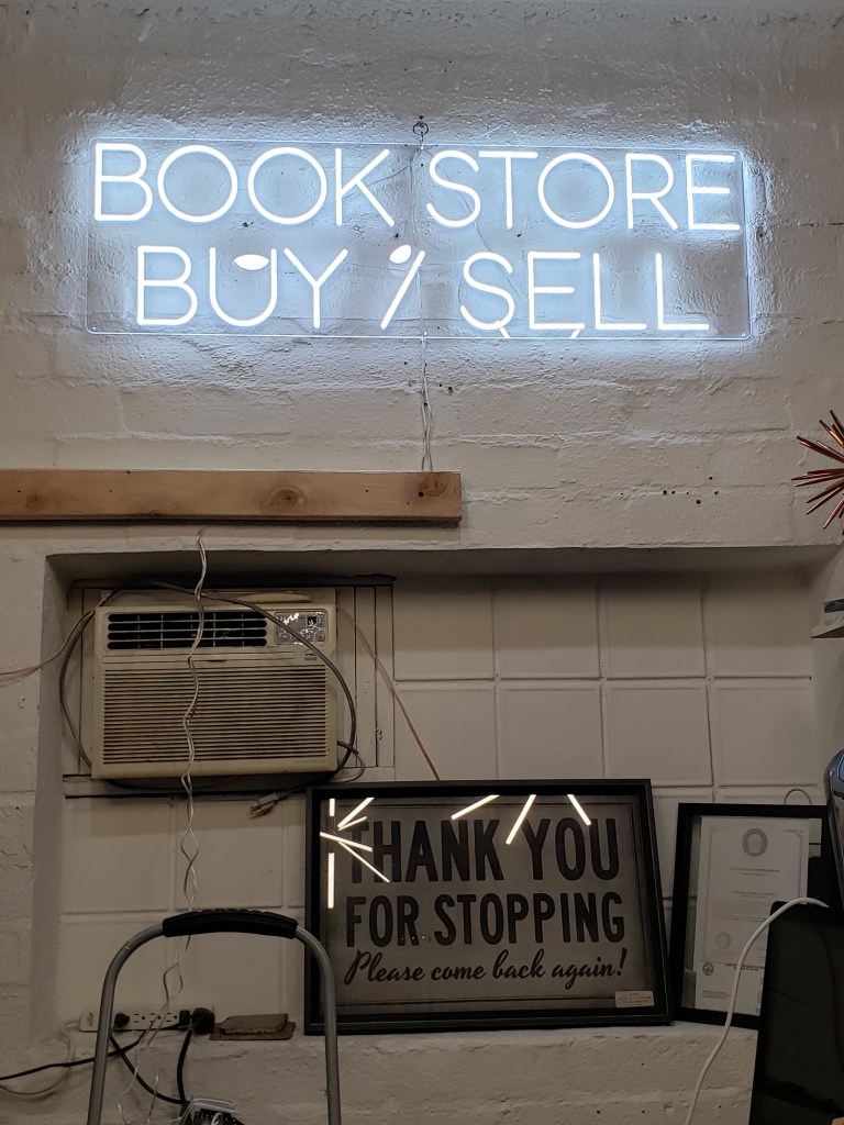 I was the only person in the store at the time, which allowed me to chat with the owner Aaron. He’s a nice guy who love books. He even told me why he decided to open a bookstore since he spent years selling rare prints online and wanted to have a physical place for them. He even showed me the display sign that turns on. Bottom is the picture I took of the both of us.