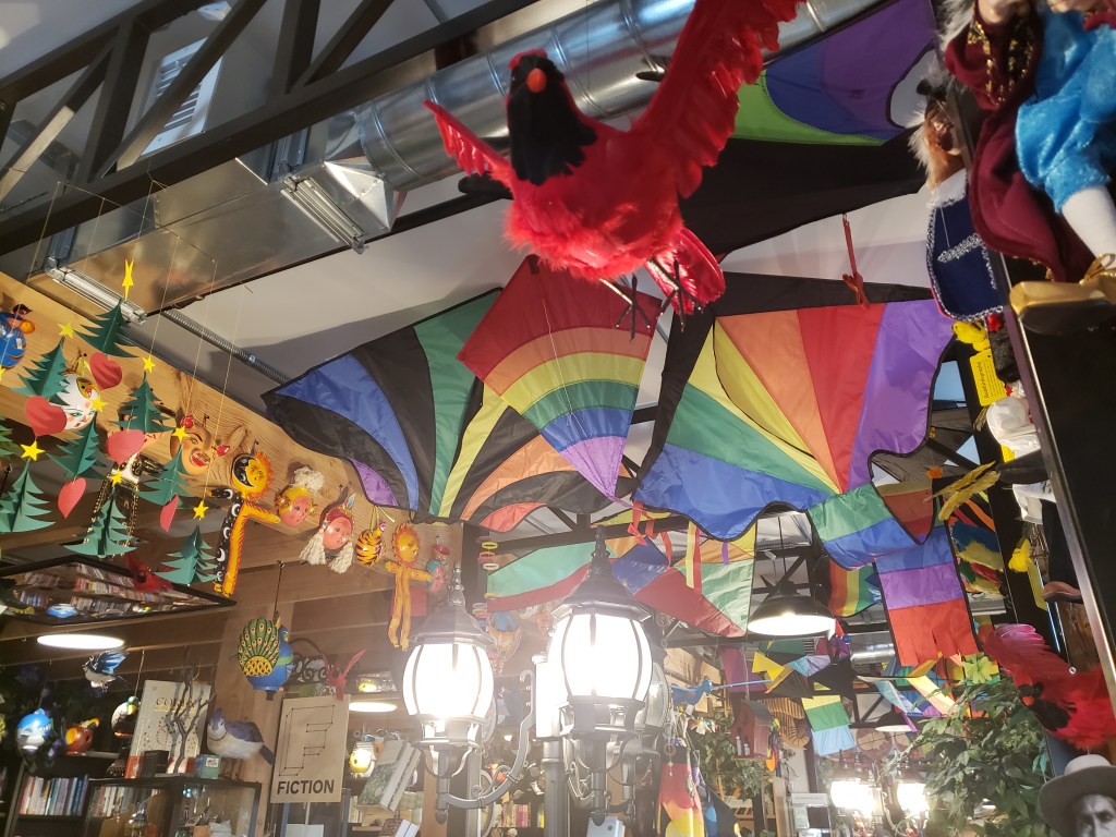 There was a little entrance to the bookshop itself off to the side. What I saw was amazing. It had books galore in every possible genre, and they were organized in well put together displays. Also, it contained stationary, puzzles, and toys for sale. For the latter, many of which like kites and puppets hung from the ceiling. I’ll admit that some of the puppets were a bit creepy, but they were still cool to look at.