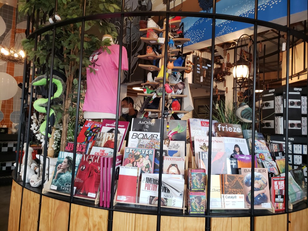 When I walked into the bookstore, the first thing I saw was the coffee shop. Specifically, I encountered a giant bird cage that held artificial birds, magazines, and other items for sale.